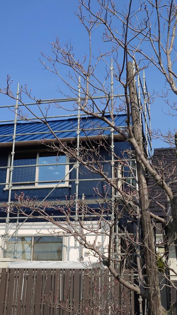 足場の向こうには、つぼみを膨らませた桜の姿も🌸