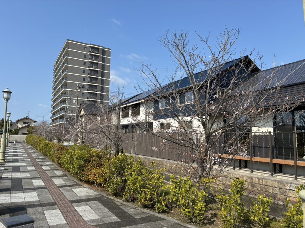 (早島展示場からの景色。贅沢に桜の景色と青空を独り占めできます🌸🌞)